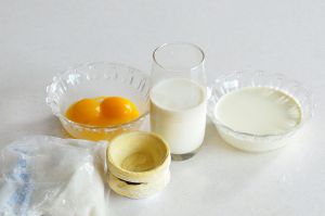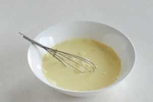 调制蛋挞水,将牛奶、糖、奶油、蛋黄放入碗中然后搅拌均匀,过筛。