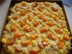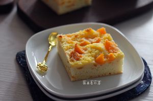 放上小块糖水黄桃,最后撒上多多的碎菠萝送入预热180度烤箱烘烤约30分钟。