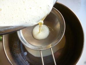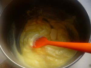 小火加热边搅拌边加热至奶糊呈浓稠状熄火,装入挤花袋备用。