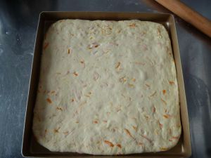 把面团擀开成比烤盘(28*28cm)略小些的方形大片,放入烤盘开始二发。