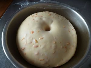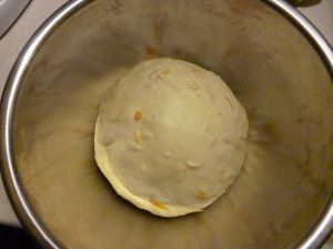 制作面团,混合除去无盐奶油和橙皮外的所有面团材料混合后搅拌至表面光滑,放入切成小块的无盐奶油继续搅拌至扩展阶段(可以拉出薄膜,破洞边缘呈锯齿状),加入橙皮碎揉拌均匀后滚圆开始基础发酵.