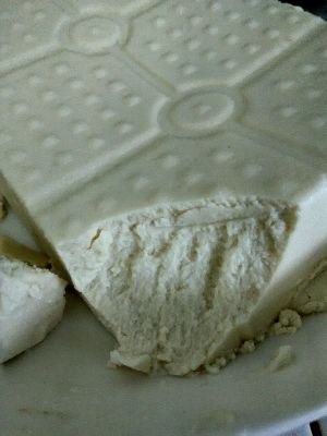 关火等它变化~忘记拍照了~这个是已经倒入豆腐盒的了~我拿那两个空的牛奶盒装满水压在上面一晚上~