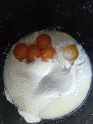 筛入低筋粉,加入分离后的蛋黄,用炒菜的方式搅拌均匀,同时把蛋清放冰箱冷冻十分钟