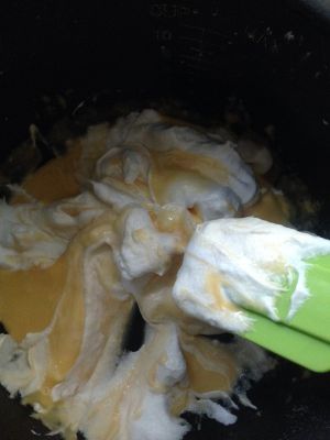 加入三分一打发好的蛋白到面糊里搅拌均匀后再把剩下的蛋白倒进去搅拌均匀