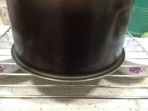蛋糕烤好后不要着急取出来,取两个杯子或碗把装有蛋糕的电压力锅内胆倒扣在上边,放凉后取出蛋糕就可以了。