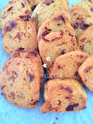 整形好后的面团放入冰箱冷冻一小时以上,然后取出放入烤箱,上下火175度15分钟就可以品尝到美味的红枣饼干了