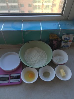 所有原料称重备齐……除黄油外,所有材料混合搅拌均匀,揉制扩展,加入软化的黄油,放在室内发孝40分钟左右……