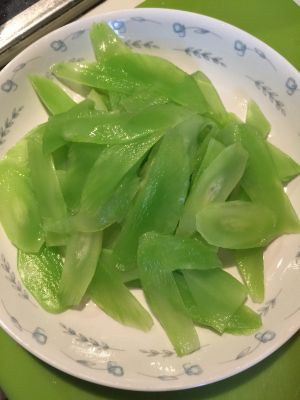 莴苣切片 或开水淖一分钟 捞起后马上过凉水 凉透后沥干水分备用