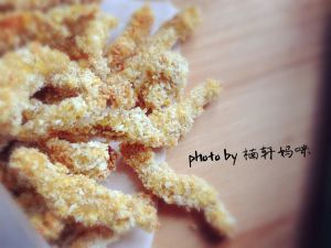 取一只碗,将鸡蛋在碗中打散;再取一只碗倒入面包糠,再撒点芝士粉进面包糠。