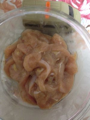 鸡脯肉切成细一点的条状,加入生抽、盐、加点水拌一下,再放点生粉再拌均匀。