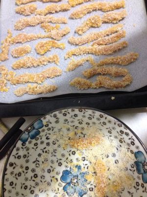 将鸡柳倒入鸡蛋液里拌匀,再一条一条捞出放入面包糠中裹均匀,放烤盘上摆好。