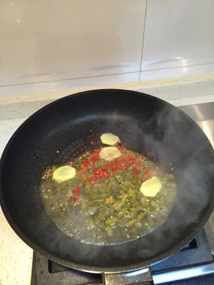 热锅热油,下姜片爆香,然后下两种剁椒。应该还有海南黄剁椒的,没买到,所以不放。