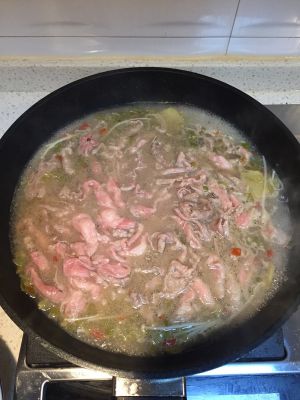 牛肉卷倒掉泡出来的血水,然后下到剁椒汤里,煮熟。撇去浮末。