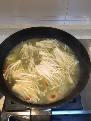 加水加盐加胡椒粉,烧开后下金针菇,等金针菇煮软了,捞起来放盆里垫底