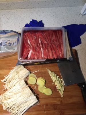 牛肉卷解冻,泡去血水,里面可以加点料酒同泡。这一步主要是去腥,不介意牛肉腥味的可以不泡。金针菇洗净切去老根,姜切片,蒜剁蓉。