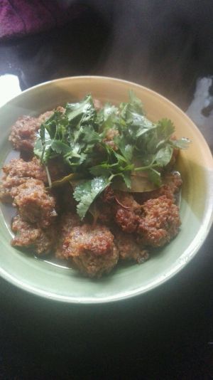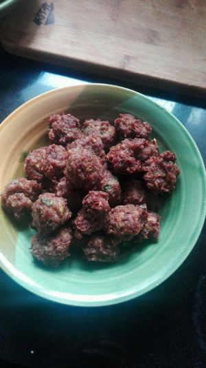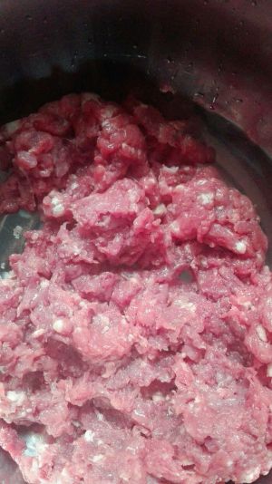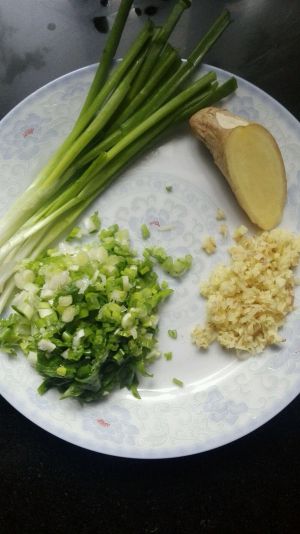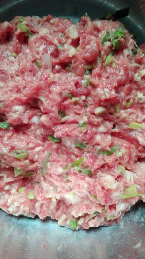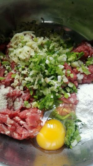 将香葱、姜、鸡蛋、胡椒粉、盐、芡放入牛肉中