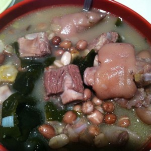 把炒锅内的东西全部倒入汤锅,加热水没过猪蹄排骨,大火半小时。加入花生和海带,中火一小时。盛碗,加盐。完成~~~