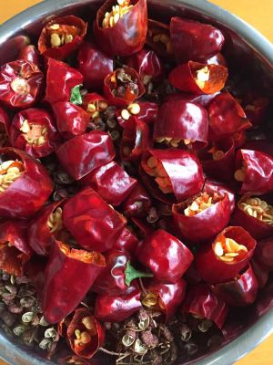 辣椒剪段,和花椒一起小火炒制,直至出香。当心炒糊。