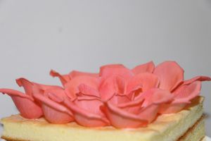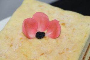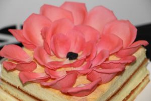取泡过盐水的玫瑰花瓣装饰在蛋糕上面即可,中间一颗黑加仑点缀