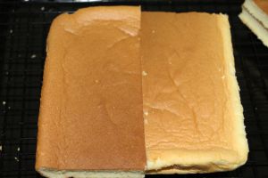 烤好的蛋糕,先对半切,把两片蛋糕叠起来再切18cm宽出来,剪一张约17cm的油纸垫在板上,把两片小的蛋糕拼起来放在底层,然后依次抹上酸奶(少许),将另外两片蛋糕依次同样方式叠起来