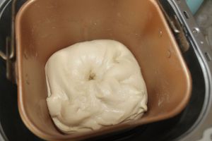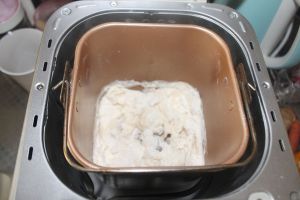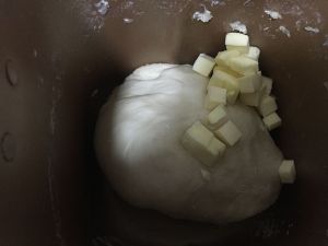 把黄油加入到揉好的面团中,开启面包机的发面程序。时间是58分钟。