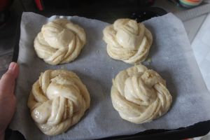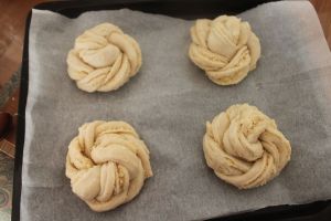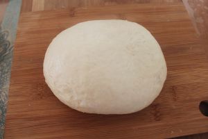 面团取出,揉一下,排气。分成八等份,70克左右一个的面团。做八个面包,我烤箱小,需要分两次烤。所以图只拍了四个的。
