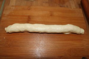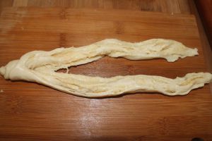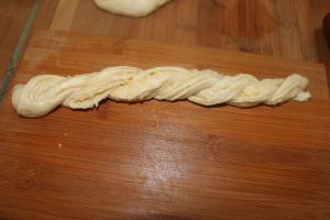 再将切开的两条面团,像拧两股绳一样拧到一起。
