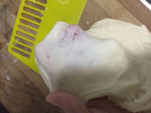 揉好的面团,检查一下出膜情况。不行的话就再摔打两下,没问题就可以进行下一步了。