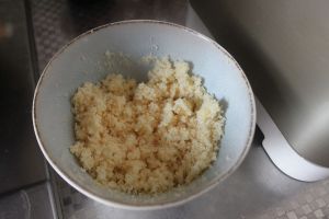 发酵面团的同时,制作椰蓉馅料,椰蓉70克,加入软化的黄油,10克糖15克蛋液,搅拌均匀。