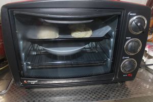 把面包放入烤箱进行二次发酵,烤箱温度调到40度,面包放上层,下层放一盘温水。时间半小时左右。