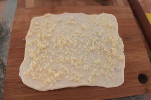将一个小面团擀成长方形。将适量椰蓉馅料平铺在面片上。