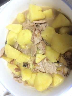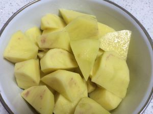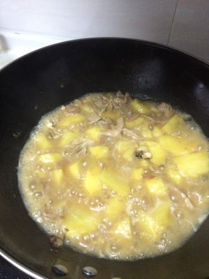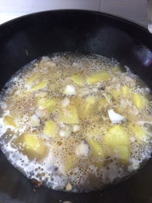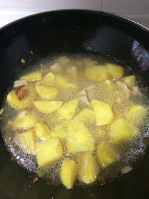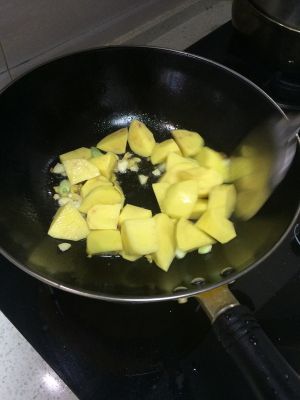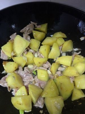热锅放油,葱蒜姜爆香,放土豆炒之