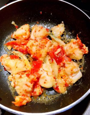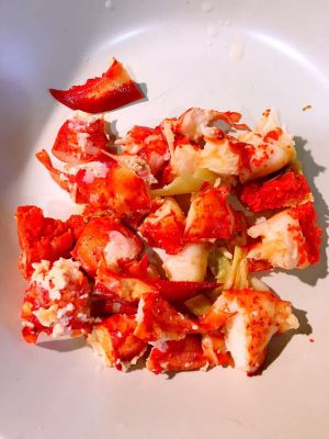 把翻炒过的虾肉装回龙虾壳中放平表面撒上芝士,烤箱预热200度,在烤箱里放入一碗水,放入准备好的龙虾烘烤10分钟让芝士表面呈焦色即可。