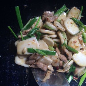 热锅放油,放几粒花椒爆香铲出,放蒜蓉,倒肉,放青椒之类,炒几下再放年糕