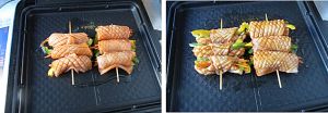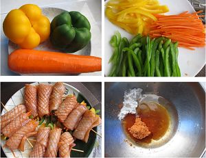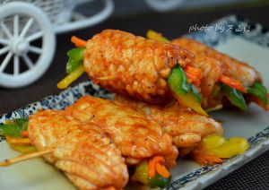 鱿鱼腌制好的时候,备好蔬菜,把彩椒和胡萝卜分别切丝,用鱿鱼片卷好蔬菜丝,并串成串,剩余的5克烤肉粉再加入食用油和少许淀粉,直接加淀粉的话再加一点点的水,调和均匀成为料汁,把拌好的汁刷在串串表面。