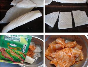 新鲜的鱿鱼,去皮从里面切花刀。我今天用的量是已经去了内脏的重量。然后切成宽度约5厘米左右的大片,加入COOK100的麻辣烤肉料25克,抓拌均匀,保鲜膜覆盖后入冰箱冷藏腌制2小时左右。