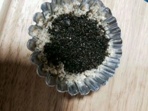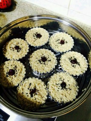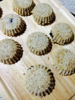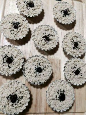 放好面粉刮平,不要压,上面放点黑芝麻,还有一颗蔓越莓,手机键碰错了,照成黑白的了。