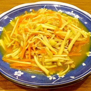 加入茭白丝、胡萝卜丝、金针菇翻炒。