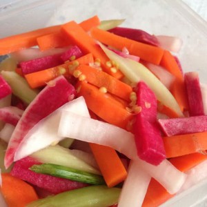 萝卜洗净,去皮(胡萝卜和白萝卜去薄皮,心里美得去厚皮),老公喜欢吃芹菜就放了一大棵芹菜(去掉叶子,斜切,还有哦芹菜叶做汤很不错哦~)分开放,放大量的盐,放置半小时以上,至煞出水分