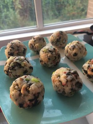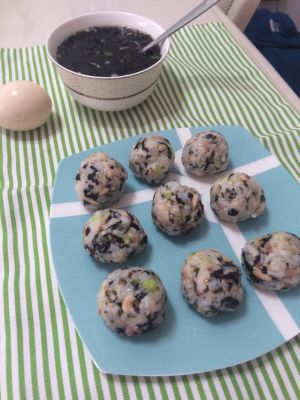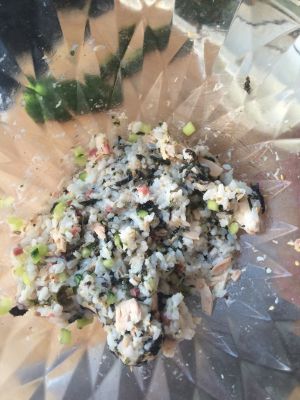 米饭闷好后先滴几滴香油在放少许盐,搅拌,最后再把食材都到里有一次性手套搅拌