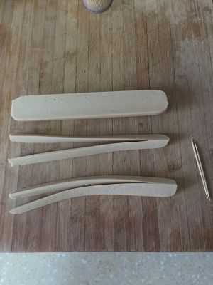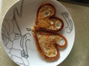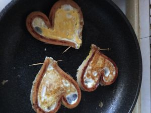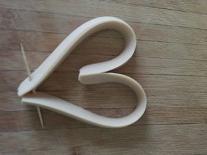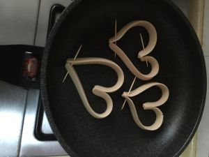 把香肠从中间切开,分成4份,取一份用刀从中间切开,但是有一头不要切开。