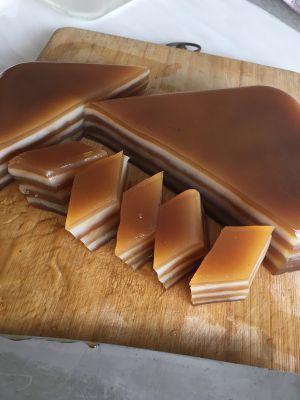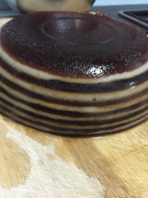 蒸熟后,拿出来,放入冰箱冷藏,一定要完全冷却后才能拿出来切。