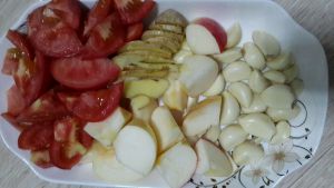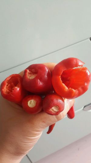 装瓶,瓶里一定要干净无水,全程都不用加水啊,你要是觉得太干就再加个西红柿也可以,装好后,上面盖一层塑料在把盖子拧紧,不用放冰箱,放阴凉地就行,一周后打开,会很香呦!