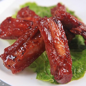 请店家将胁排剁成5厘米左右的大块,清洗干净放入一个干净的保鲜盒中备用;将生姜蒜切扁放入盒中,调入3汤匙叉烧酱、1汤匙蚝油拌匀;