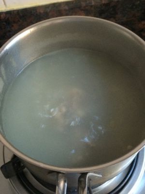 汤锅里倒入1.2升水烧开加入猪骨头中小火炖半小时