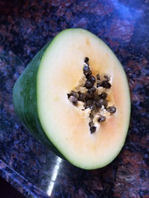 要煲汤的木瓜要青一点的,这种煲汤最合适!如果要用做甜品的就要红一点的!