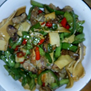 锅中放油,待油热后放青椒和四季豆,中火炒约3分钟左右,不要加水