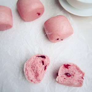 取适量用来整形的面粉,撒在案板上防沾,揉面团排气,反复用擀面杖擀,撒面粉,重叠。直到完全排气好,擀成长方形。均匀铺上切碎的蔓越莓干。