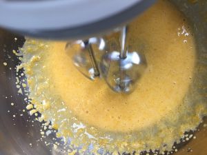 蛋黄加细砂糖用电动打蛋器打至体积膨胀至2倍大、色泽变白