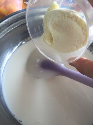 牛奶加奶粉拌匀、倒入锅内用小火煮至锅边冒小泡
